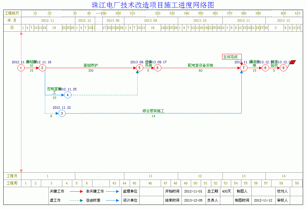 | 1、如下图所示。参照网络图的自然日历以及工程日历,大概能够看出每个工作的开始结束时间。如果每个节点或者重要节点显示对应的日期,就可以更清楚的显示工作开始结束的日期。 |