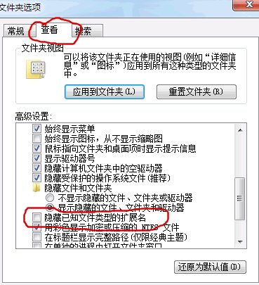 | 9、弹出的“文件夹选项”窗口中,找到“查看”-》“隐藏已知文件类型的扩展名”,把前面的勾去掉。 |