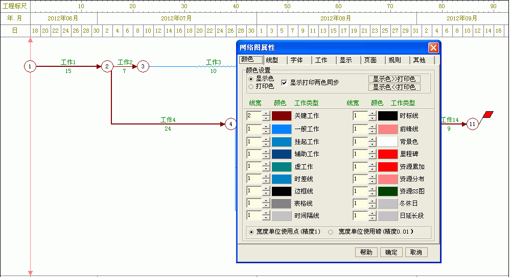 2、颜色窗口:在这个窗口中,可以设置网络图中各种工作的颜色和线型。(下图中的“工作2”是被设置为重要工作,所以看上去和关键线路的颜色是一样的。为了引起误解,这里解释一下。如何设置重要工作,看这里 指定某些工作显示为关键工作(或非关键工作)---重要工作