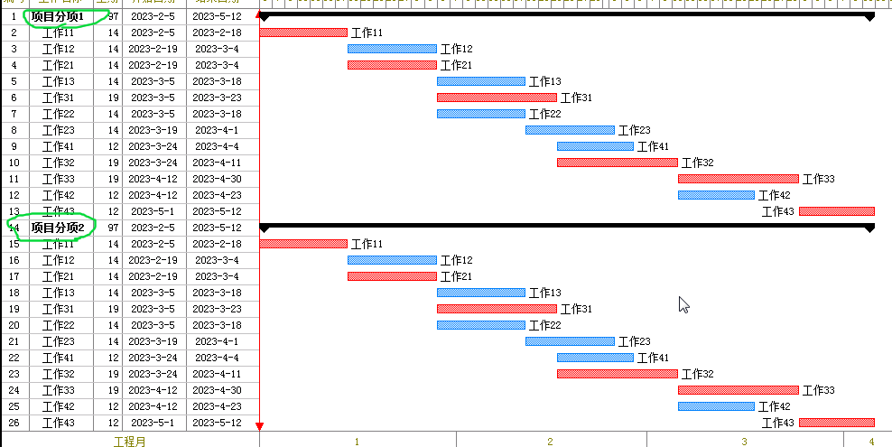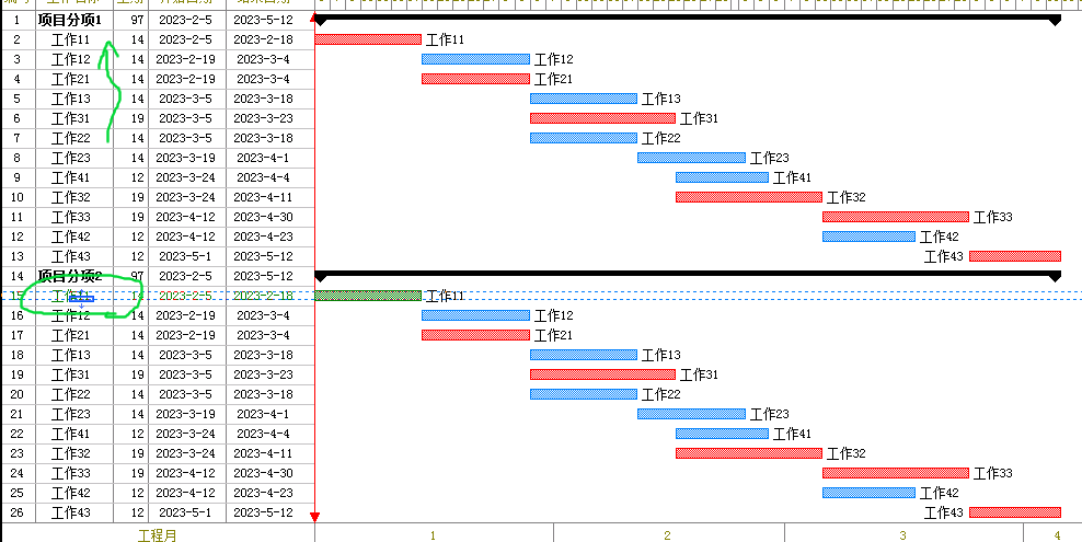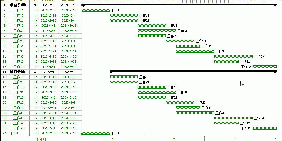 | 2、鼠标移动到“项目分项2”的子工作上,按下鼠标左键,拖动到“项目分项1”的工序所在行。 |