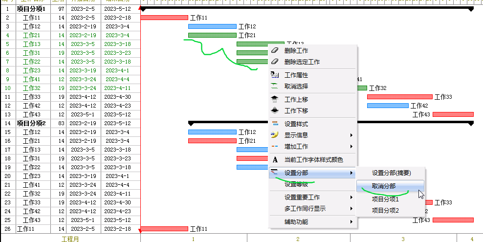 5、如果要取消某个工作的分部设置,鼠标移动到对应工序的矩形框上,右键-》弹出菜单-》设置分部-》取消分部。 |