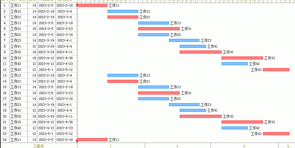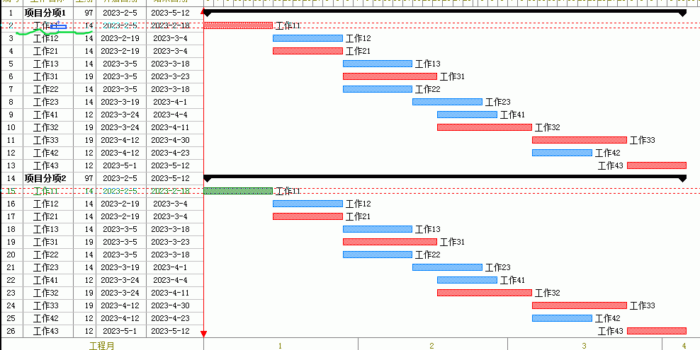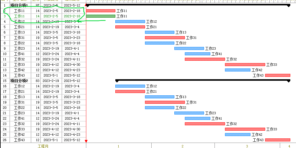 | 4、这是拖动后的效果。(拖动,只对横道图有效,没有同步双代号工序位置) |