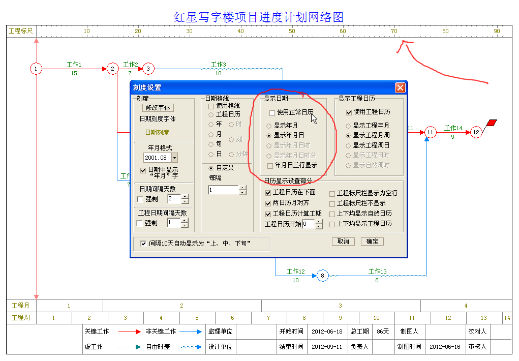 年月日:显示网络图中各个工作节点对应的开始、结束日期时间。